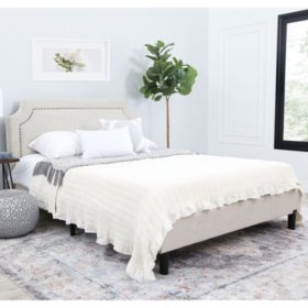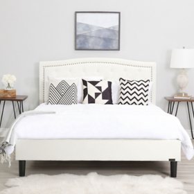 Ellie Cream Linen Upholstered Queen Platform Bed, Curved